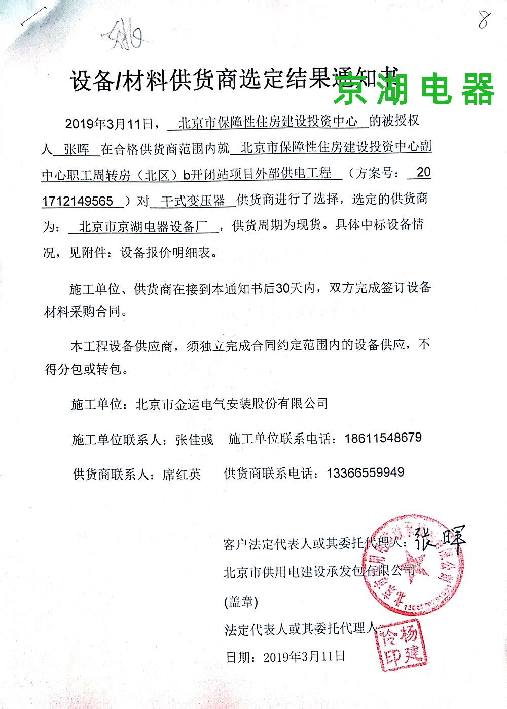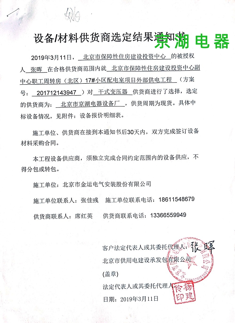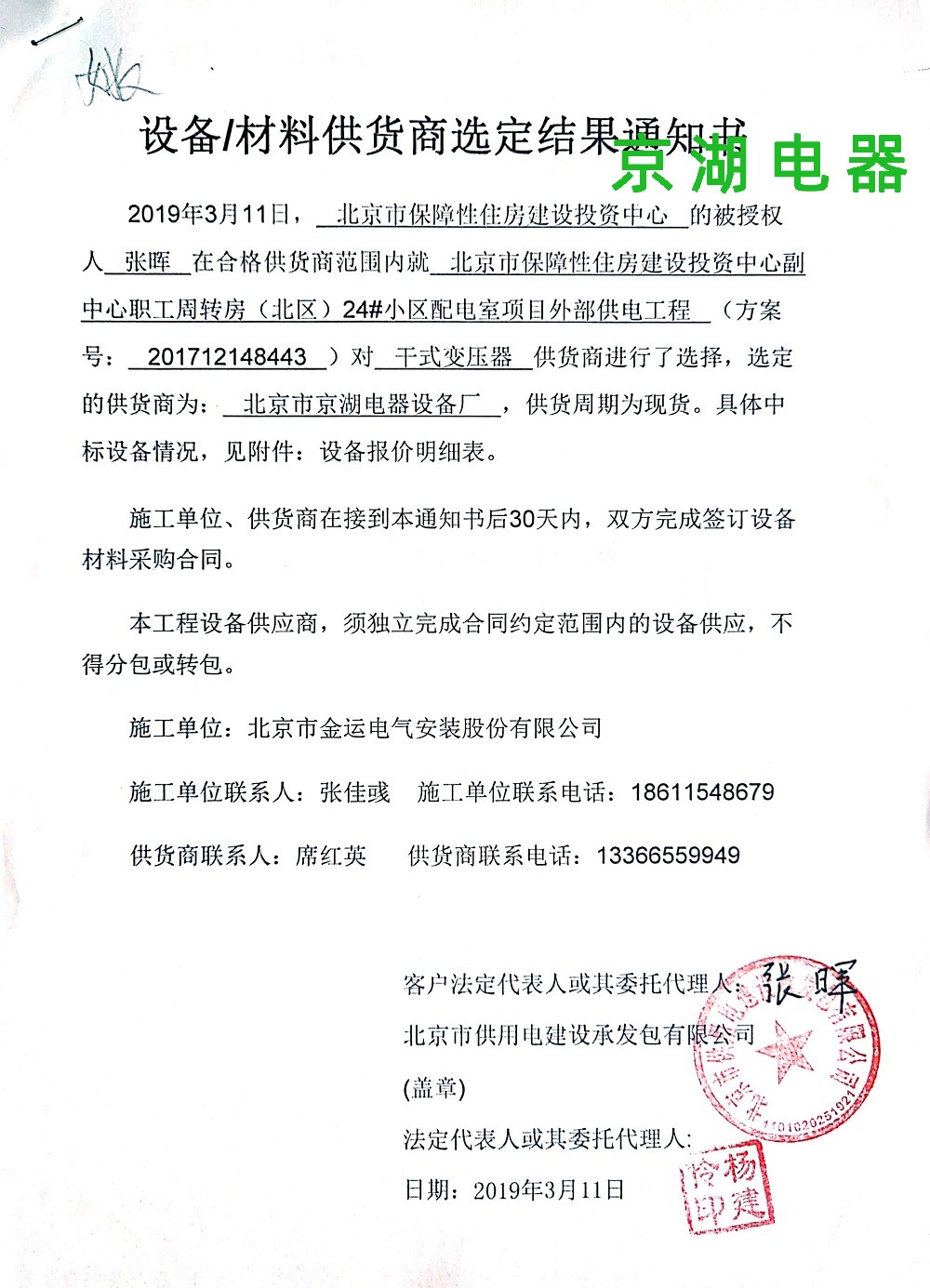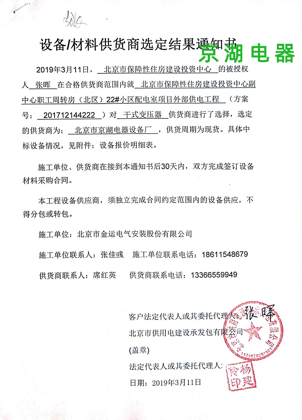 北京市保障性住房建設投資中心 供應商選定結果通知書 2019年3月11日