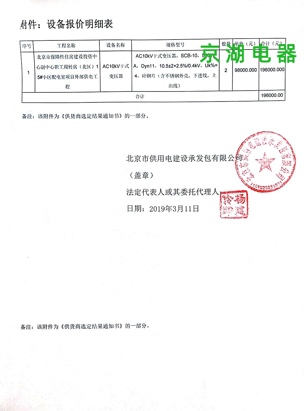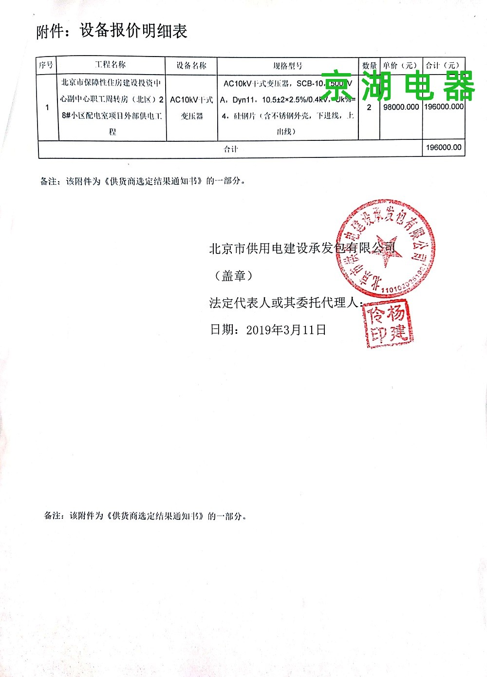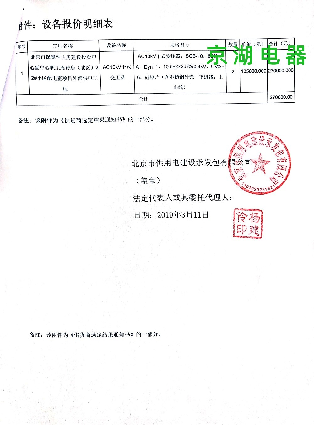 北京市保障性住房建設投資中心 供應商選定結果通知書 2019年3月11日