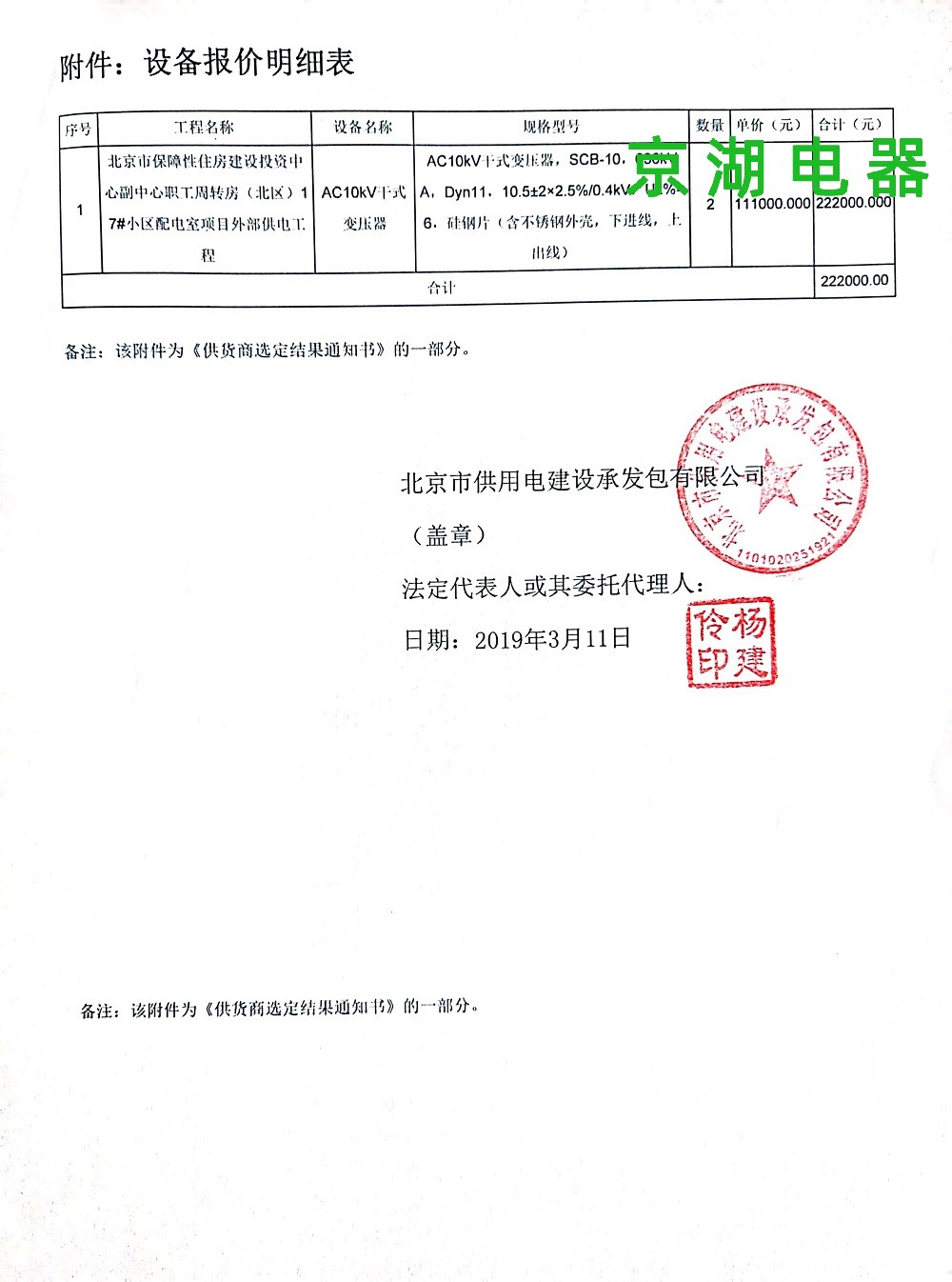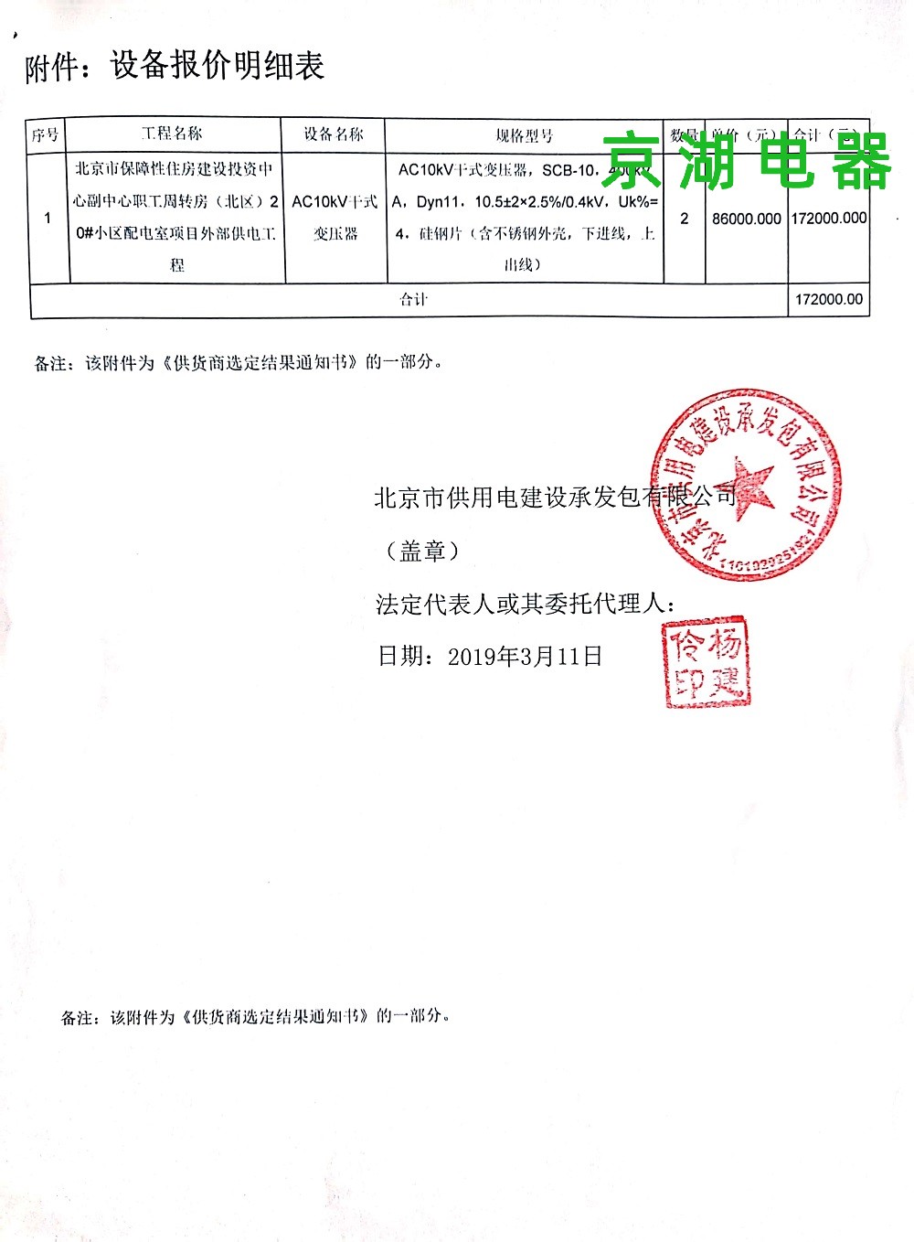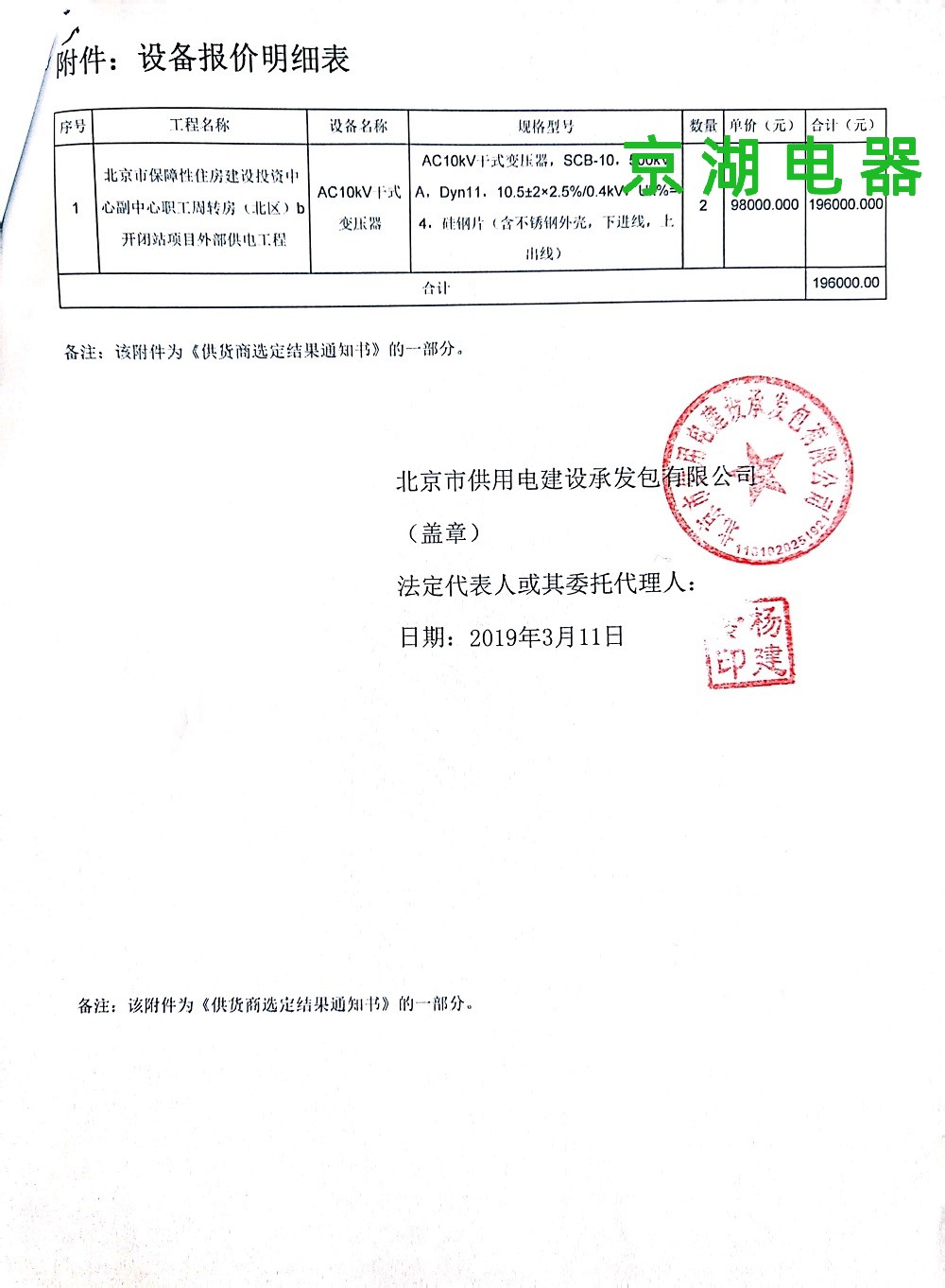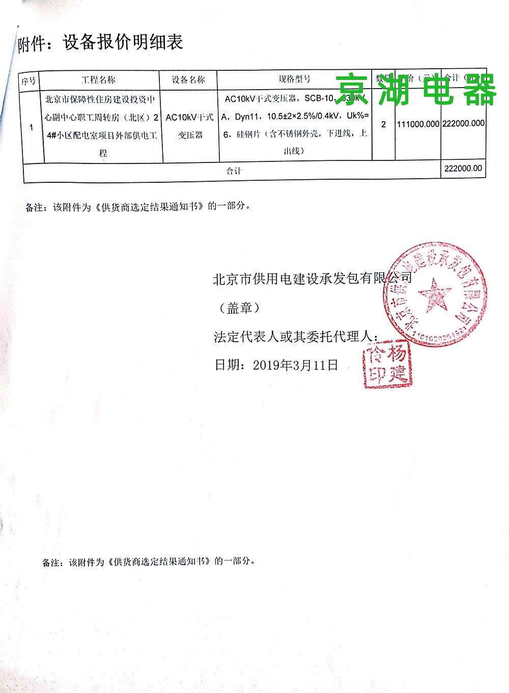 北京市保障性住房建設投資中心 供應商選定結果通知書 2019年3月11日